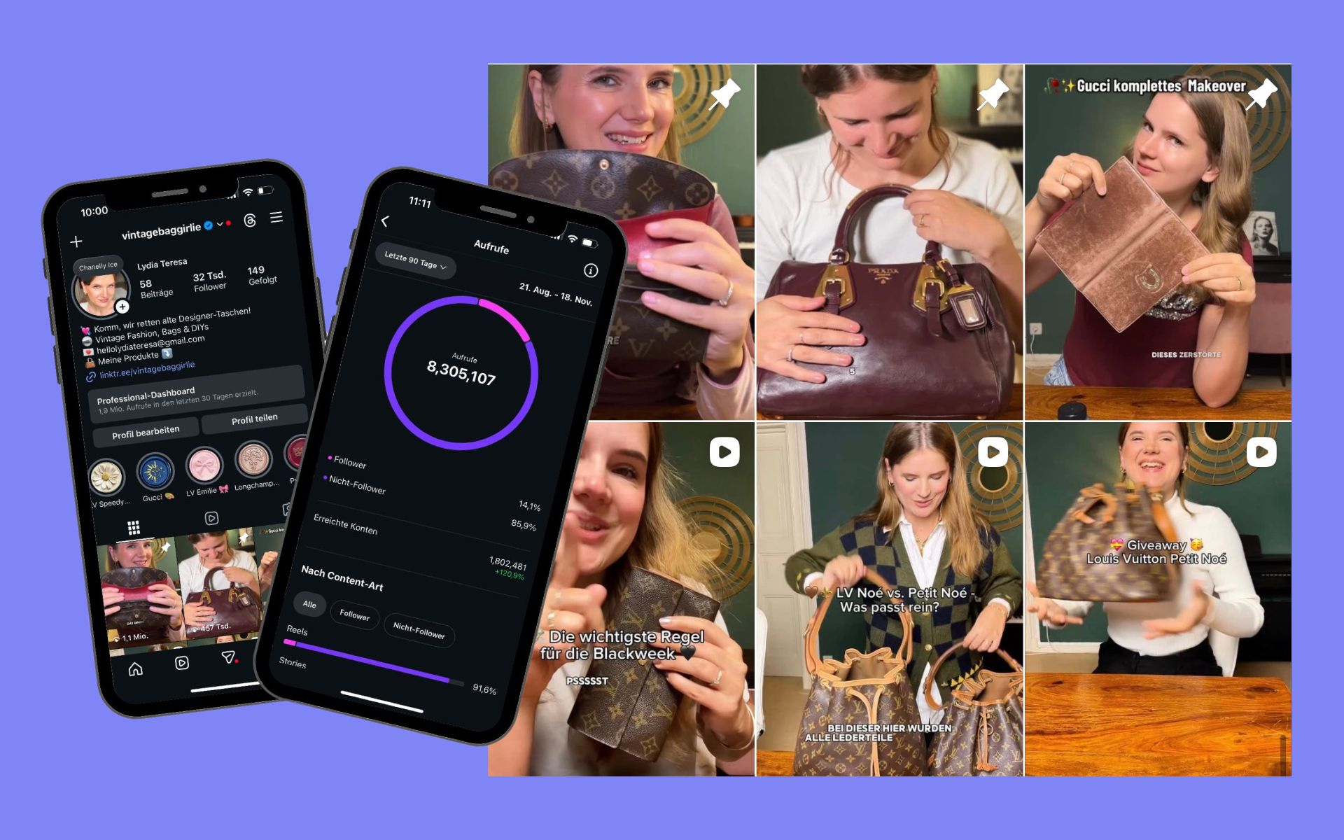 Folgen kann man mir als @vintagebaggirlie – dort zeige ich alles rund um Vintage-Luxustaschen, Secondhand-Funde, Aufbereitung und die ganze DIY-Welt dahinter.